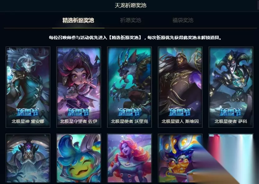 英雄联盟天龙祈愿活动皮肤介绍 开启福袋优先获得1款福袋奖池内未解锁道具,包含龙的传人 李青,莲花之令 卡尔玛,哥特萝莉 安妮等等珍稀限定皮肤。 首次6元,100%解锁1款皮肤。每位召唤师首次参与活动,即可使用60钻石开启1次,优先获得1款未解锁皮肤。 奖池精选,无图标无炫彩。本次祈愿分为【精选祈愿奖池】及【祈愿奖池】,奖池全部由皮肤构成,无图标无炫彩。其中所有召唤师参与默认进入【精选祈愿奖池】,只有在【精选祈愿奖池】道具全部解锁的情况下,进入【祈愿奖池】。 幸运福袋,优先获得未解锁道具。开启福袋优先获得1款福袋奖池内未解锁道具,包含龙的传人 李青,莲花之令 卡尔玛,哥特萝莉 安妮等等珍稀限定皮肤。
