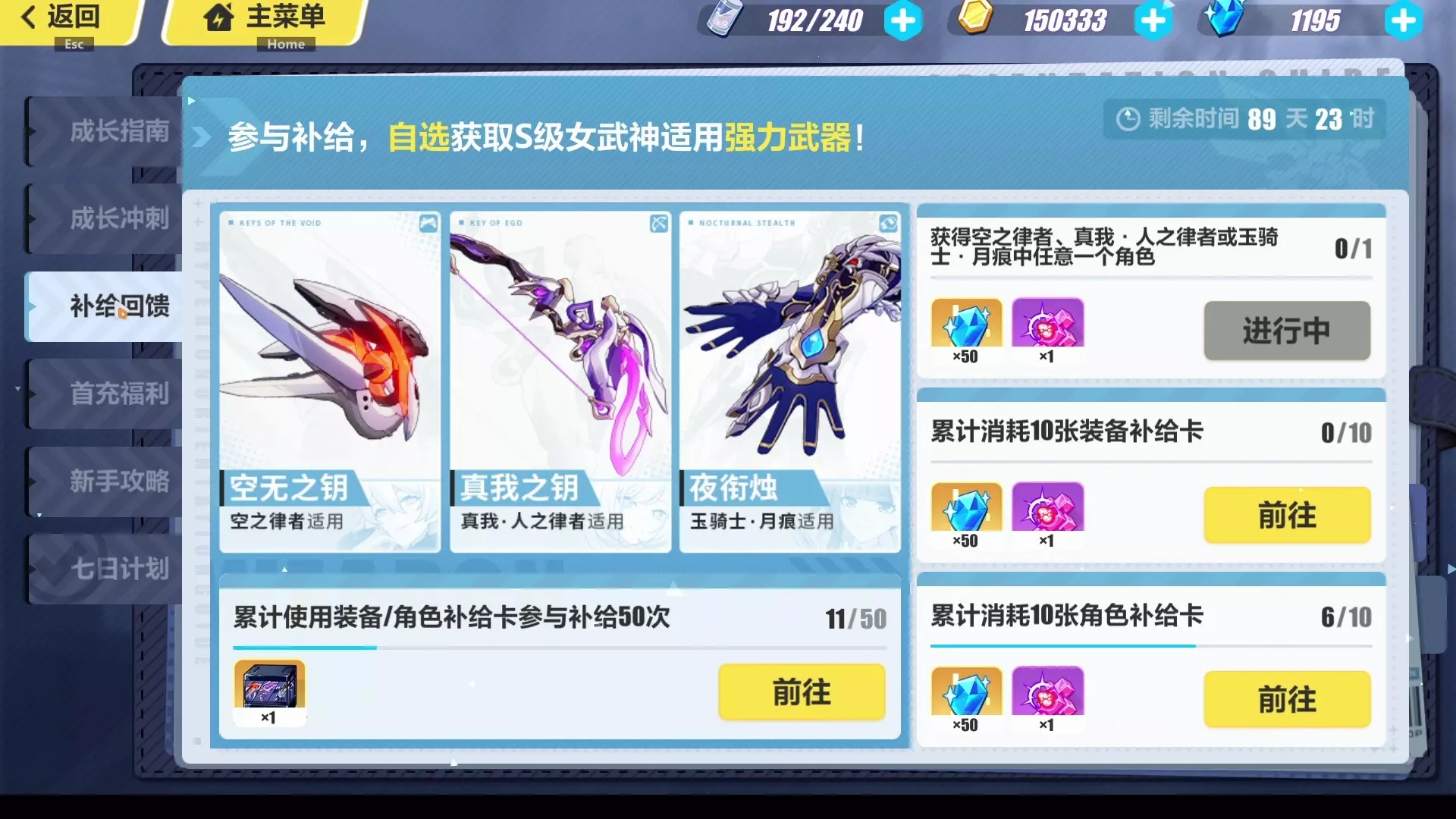 这是《崩坏3》的手游情报,展示了补给回馈活动,累计补给50次可领武器自选箱,打开能自选爱莉希雅适用的真我之钥等强力武器,解决了爱莉希雅的武器获取问题,活动剩余81天09时。