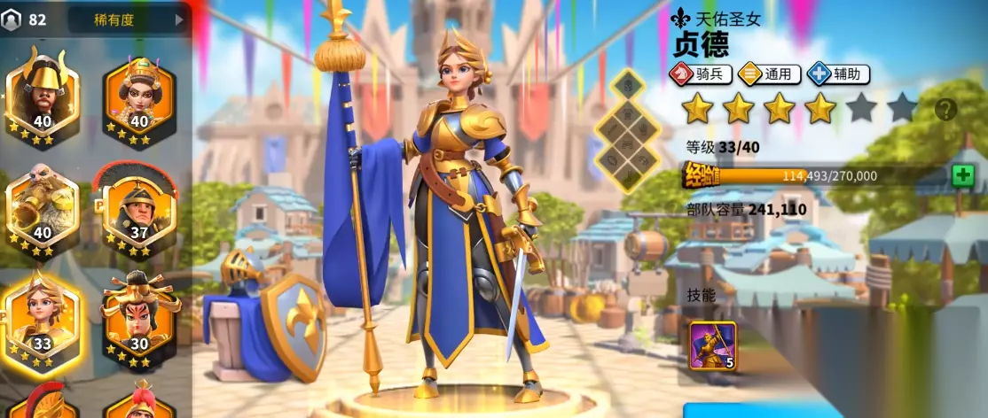 贞德作为史诗品质的辅助将领,在资源采集和团队增益方面表现突出。她的旗帜技能能提供全兵种属性加成,且怒气恢复效果显著提升队伍持续作战能力。紫色骑兵将领贝利萨留拥有优秀的机动性和残血收割能力,战术迂回天赋对生命值低于50%的部队可造成额外伤害。拜巴尔作为次选骑兵将领,与贝利萨留形成互补,两者都是平民骑兵队的重要组成。