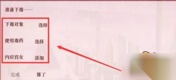 1、在自己选择下毒确认之前,自己的物品栏里是找不到毒药的; 2、然后你可以选择你要下毒的妃子,查看她的侍奉宫女是谁,然后选择收买; 3、有些宫女是心机较重、比较灵活的,这样的大概要收买个3次左右,锋芒未露野心的要大概4、5次,恪守本分的1次就好,在宫女的好感达到70左右,就可以成为你的内应了; 4、然后返回寝宫,选择宫廷事务; 5、打开页面后,选择使用毒药,就可以根据提示下毒了。 以上是小编为各位带来的全部内容,更多精彩游戏资讯,请持续关注。