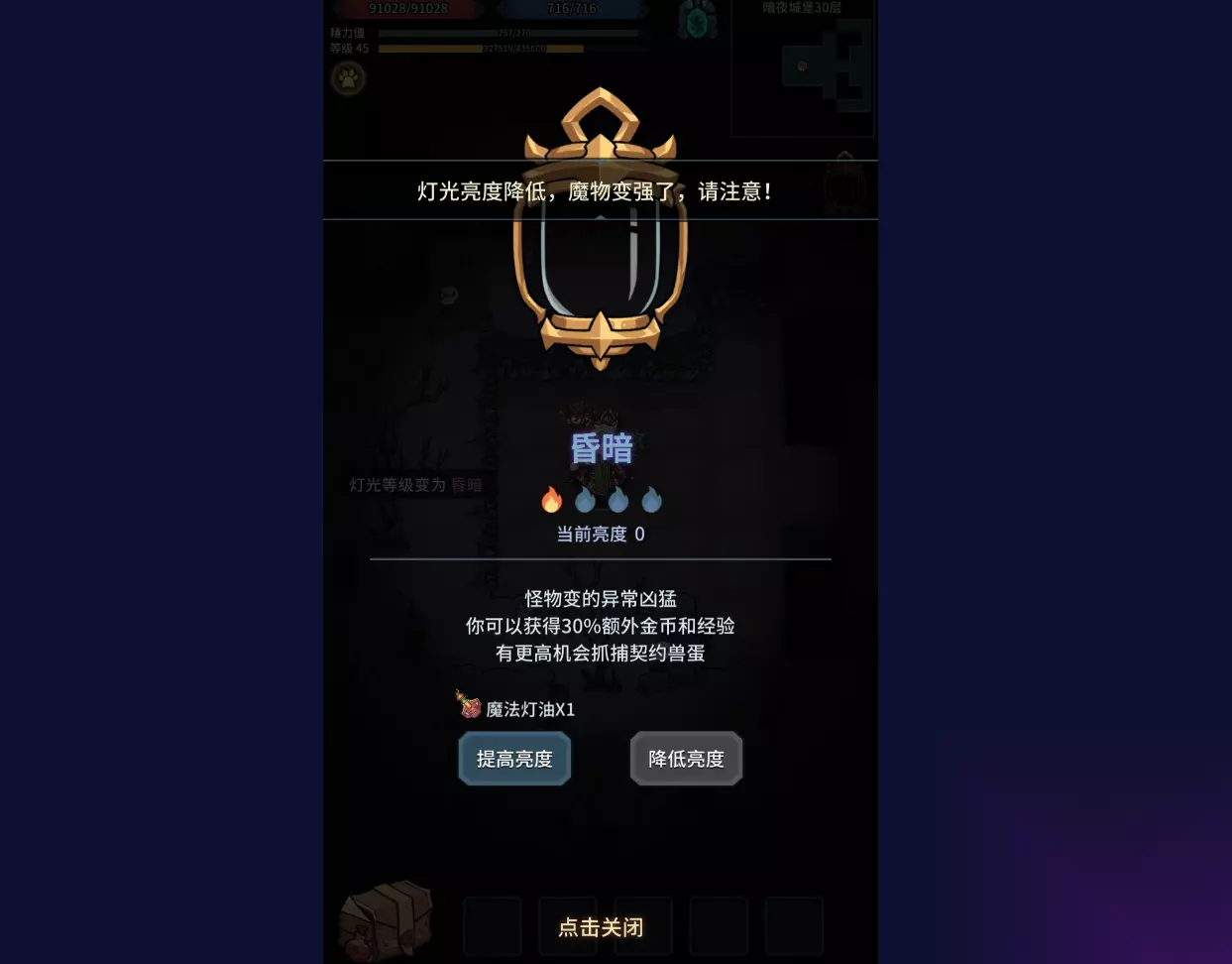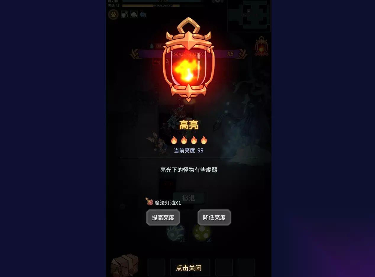 这里的亮度指的是提灯的亮度,提灯在不同的亮度情况下怪物们会获得一些buff,这些buff在不同的情况下对我们的帮助是不一样的。所以小编也会和大家聊一下怎么样利用亮度来实现我们利益的最大化,游戏中提灯的亮度分为四个档次,提灯越亮怪物们的属性就越低,我们越好通关。亮度越低,怪物越强,我们也可以获得更多的经验和金币,到了最暗的程度,我们还有额外契约兽蛋掉落几率的加成。
