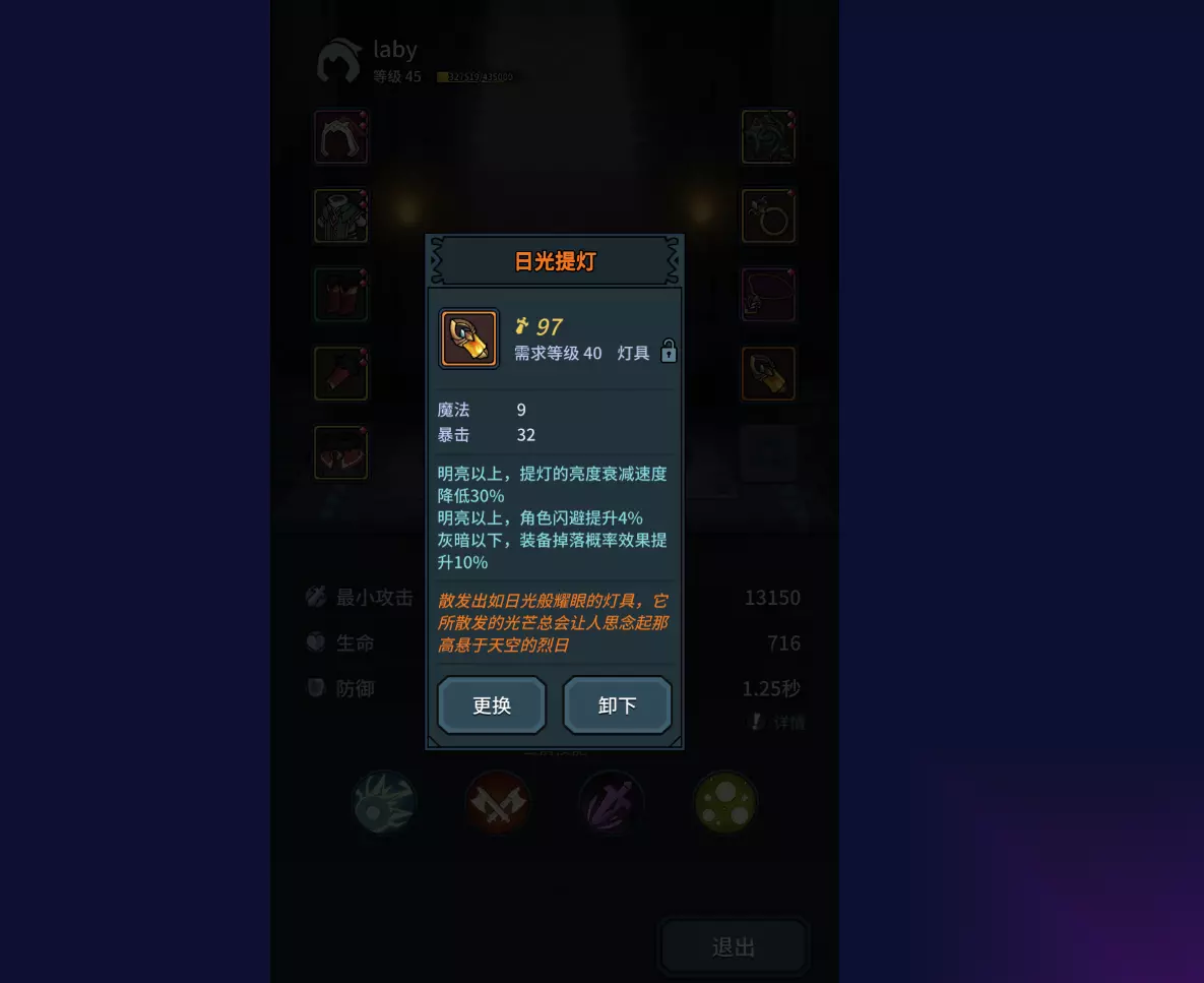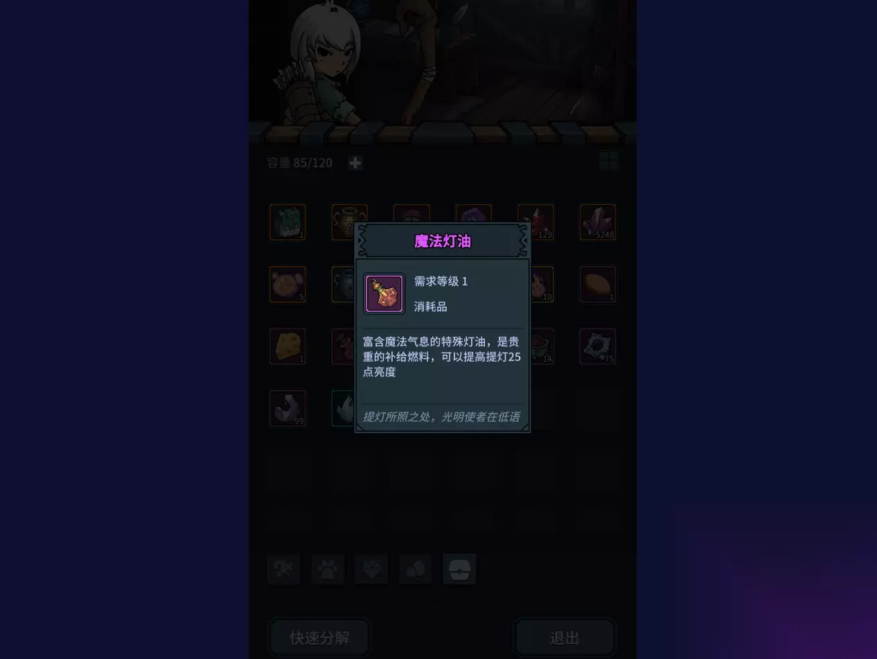 亮度还受我们的控制,想要降低亮度除了自动灯油的减少以外,我们还可以自动降低亮度。想要提升亮度我们需要消耗一个魔法灯油来增加25点亮度,也就是一个档次。还有副本中会掉落一些提灯类的装备,这些装备可以在不同的亮度下提供不同的效果,也是很有用的。