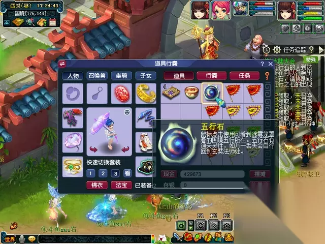 然后右击五行石,地图上会出现放置位置 到达坐标后右击放置,不要散队 所有五行石放完,按任务提示顺序扭动五行石 打开地图(Alt+Tab),√任务 可以看到五行石属性