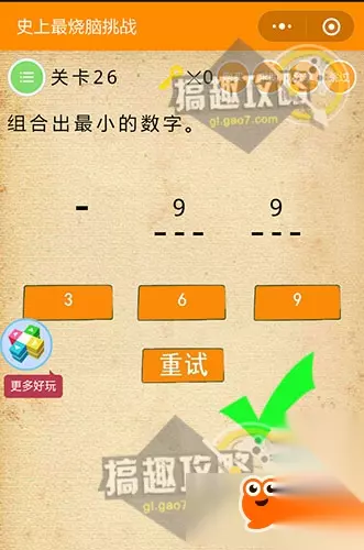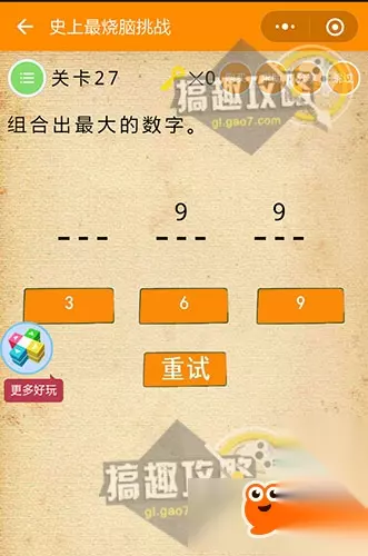 最前面那个空是能向上拉动的,变成负号后点击数字9 9. 史上最烧脑挑战第27关攻略: 组合出最大的数字。