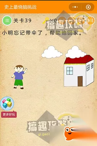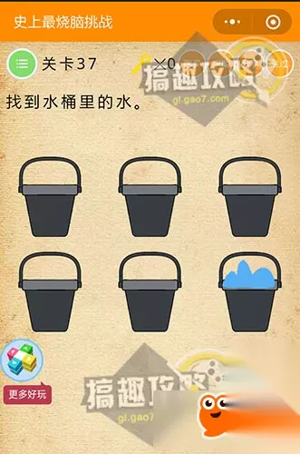 将上面的云重叠起来,下雨后老虎就消失了,再将小明拖动到家里即可~ 史上最烧脑挑战第37关攻略: 找到水桶里的水。