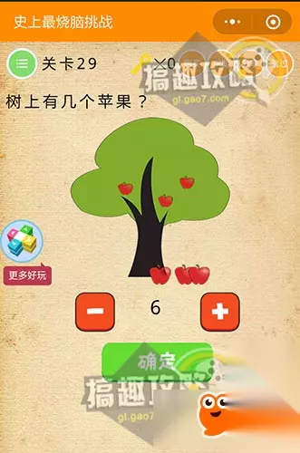 答案是6~ 史上最烧脑挑战第29关攻略: 树上有几个苹果?