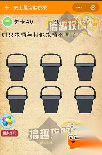 将乌云拉开雨就停了,再将小明拖动到家里即可~ 史上最烧脑挑战第40关攻略: 哪个水桶与其他水桶不同?