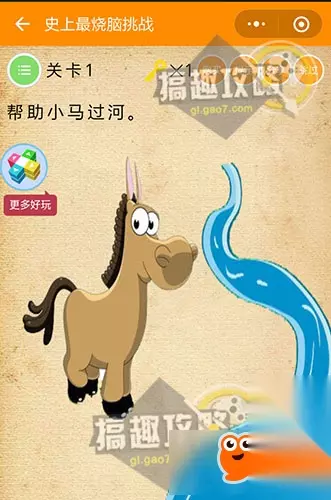 史上最烧脑挑战攻略,下面就为大家详细讲解史上微信最烧脑挑战全关卡图文攻略,希望这篇通关攻略对有在玩这款游戏的小伙伴们有所帮助。 史上最烧脑挑战第1关攻略: 帮助小马过河。