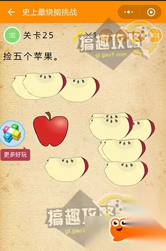 选择1(题目上都说了1=5啦~ 史上最烧脑挑战第25关攻略: 捡五个苹果。