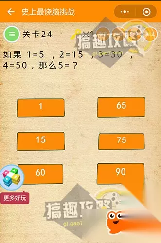 用云先把太阳挡住~这样就看到了吧~ 史上最烧脑挑战第24关攻略: 如果1=5,2=15,3=30,4=50,那么5=?
