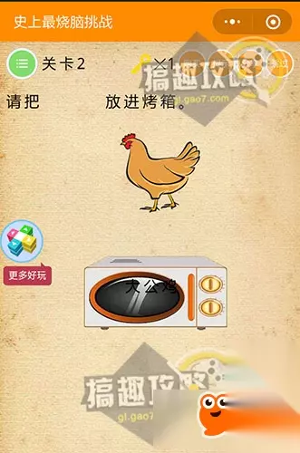 直接将河水向左边拉动即可~ 史上最烧脑挑战第2关攻略: 请把大公鸡放进烤箱。