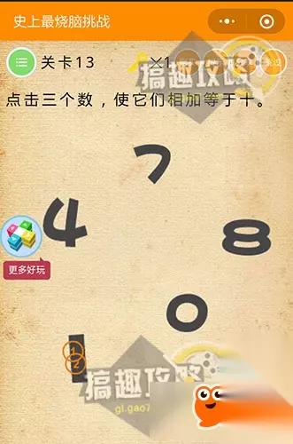 在字样上摩擦摩擦~就能看到真正的雪碧了~ 史上最烧脑挑战第13关攻略: 点击三个数,使它们相加等于十。