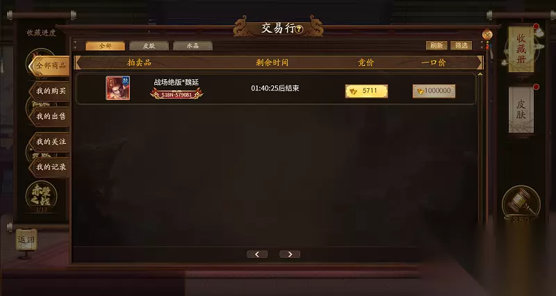 皮肤交易条件: 1、账号通过实名认证 2、角色等级达到100、激活会员并达到VIP5 3、游戏内成功设置二级密码 购买规则: 1.在交易行只能使用通用元宝进行交易 2.玩家无法购买自身上架的道具,也无法对自己上架的道具进行竞拍 3.玩家每天可购买的道具数量存在上限,上限满后当日不可继续购买道具 4.购买的道具会有30天的交易冷却期,冷却期期间,该道具无法再出售 5.竞拍时,系统会自动扣除玩家身上相应数量通用元宝,对同商品进行加价竞拍时,会先返还之前的通用元宝(需要主动提取),然后再扣除加价后的通用元宝总数 6.每次有玩家对道具进行竞拍加价,会延长5分钟的道具竞拍时间 7.交易行内的元宝消费不计入任何元宝消费任务及消费排行榜 8.交易行内购买的道具将不会触发公会红包 道具提取: 1.所有购买的道具、出售所获得的元宝、竞拍时返还的通用元宝,均需要玩家主动提取 2.提取流程:皮肤——交易行——我的购买/我的出售 3.为保障买卖双方的账户安全,出售所获得的通用元宝需要交易完成的三天后才能提取 不知道这个答案有没有解决你的问题,如果觉得《三国杀》十周年皮肤交易行购买皮肤方法这篇攻略没有问题,不妨在收藏此页面,233乐园小编会在后续进行更新。