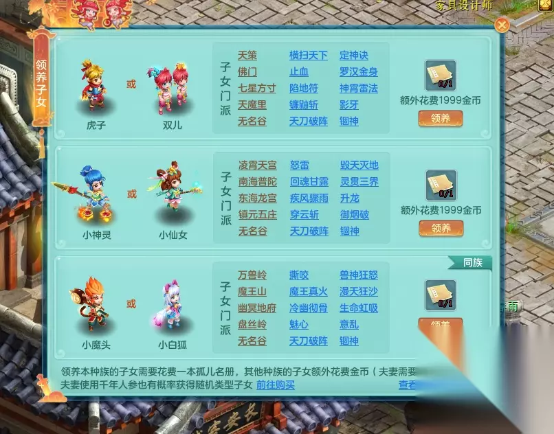 孩子的获取方式有两种,第一种是靠已婚夫妻生育获得,第二种是在姚婆婆处使用孤儿名册进行领养。其中生孩子需要夫妻之间的好友度达到2000,并且等级在55级以上,在家园管家处使用千年人参或子母河水便可进行生育。如果说你还没有结婚,那么也可以选择使用孤儿名册进行领养。值得注意的是,如果是领养孩子还可以指定其种族哦,自然生育的孩子种族将会在父母种族中随机确定。
