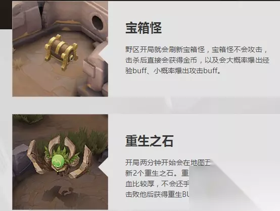宝箱怪 地图上野有野怪,和带BUFF属性的东西,宝箱怪我们在冒险模式里遇到过也没什么稀奇,除了会获得金币外还有大概率爆出经验BUFF,小概率爆出攻击BUFF! 重生之石 开局后2分钟刷出,在地图上的5个BUFF点中随机刷出,怪的血量比较厚但是没有攻击性,会在圈内乱跑,击杀后会有大量金币和属性!