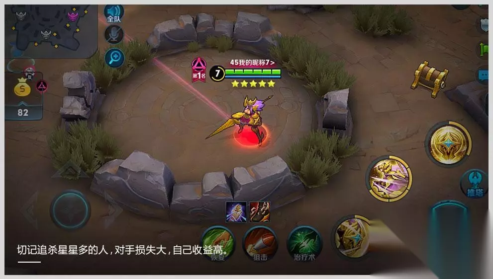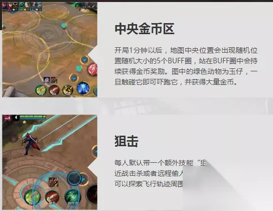 中央金币区 开局1分钟后,地图中央会随机出现5个圈圈,站着圈内可以持续增加金币,还有一个绿色的小怪,碰到后会吓跑,击杀有大量金币! 对局技能:狙击 系统默认自带一个狙击技能,有点类似后羿的小化版大招,可以远程收割人头。并且还有探测视野的功能。