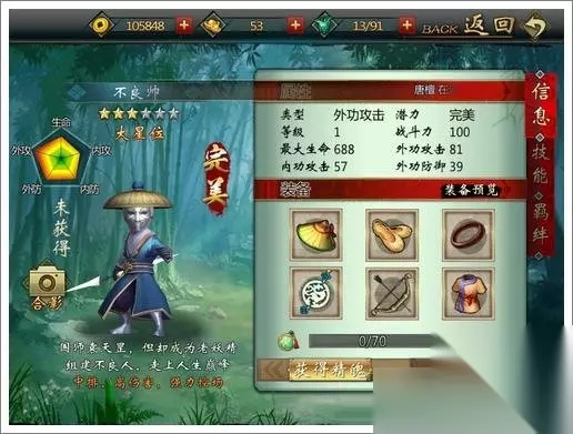羁绊关系 主仆之谊:外功暴击+50,拥有侠客李星云时可激活,激活后属性永久生效 卧底任务:外功攻击+5%,拥有4星侠客孟婆时可激活,激活后属性永久生效 曾经部下:外功攻击+5%,拥有5星的侠客温韬时可激活,激活后属性永久生效 手下走狗:外功暴击+15%,拥有5星的侠客上官云阙时可激活,激活后属性永久生效 获得途径:乘风破浪第80-100关获得,或者酒馆招募获得 作为最强阵容成员之一,不良帅的实力自然毋庸置疑,拥有群控,群伤,外加能汲取怒气,可谓是PVE和PVP中的一霸,对于这样的侠客来说,就不用说他的优点缺点了,只要能获得就是非常具有培养的价值,但是最为最强阵容成员之一,不良帅的获得途径是比较困难的,推荐各位玩家在游戏前期不要消耗过多的体力或者元宝在不良帅上,通过慢慢收集,到游戏后期有能力了在替换成不良帅。