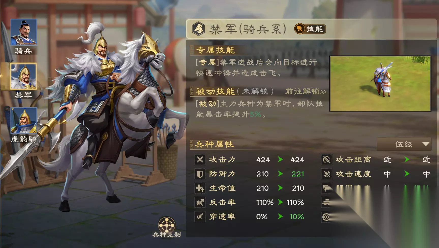如果想进一步提升输出,也可选择“吕布+黄忠”的配置,吕布有武力数值支撑再加上高额技能系数,也可以有相当高的爆发,而且吕布可提升“抗震率”,降低反震伤害,能够更好的维持部队兵力健康。 3、环境相关分析 技能体系的特点是“主动技”爆发高,如果在初期触发“回满怒气”效果,可以更快的压低敌方兵力(快速降低敌方兵力,可降低战损,相当于可提高队伍输出)。 技能队比较怕沉默、降低怒气效果,在实战中建议规避控制队、反击队,打其他阵容均有较大优势,我们在构建骑兵队时,可优先找各类盾兵阵容,盾兵体系输出慢,再加上兵种克制,软柿子可以随便拿捏。 五、兵种选择