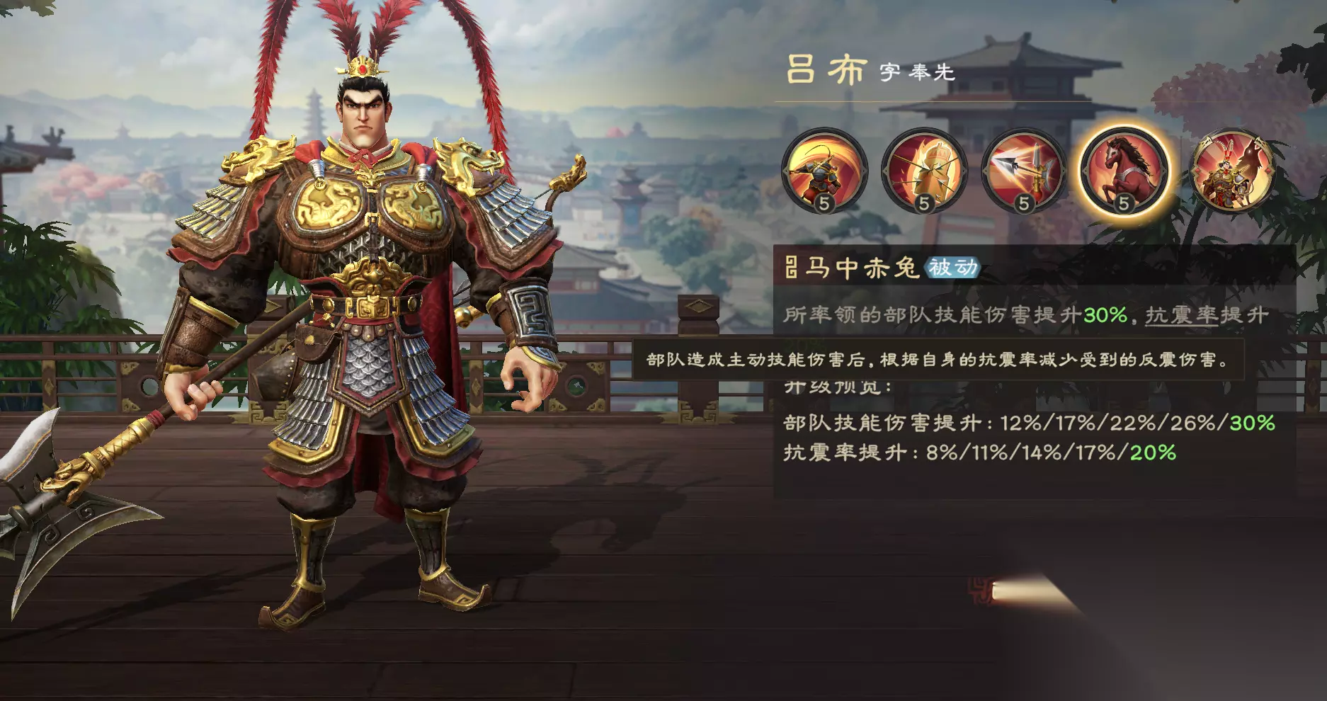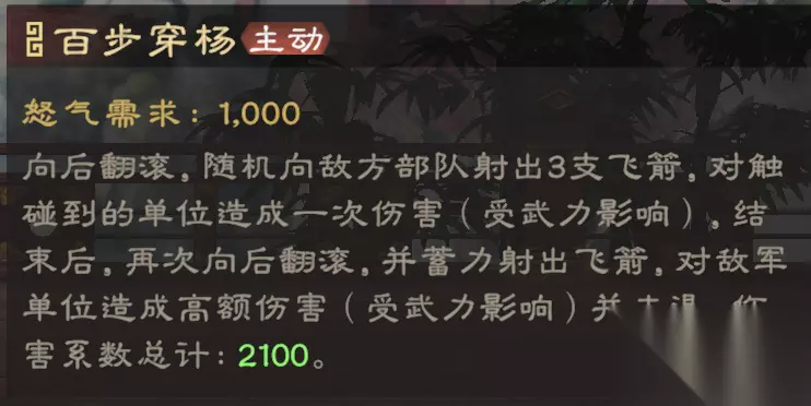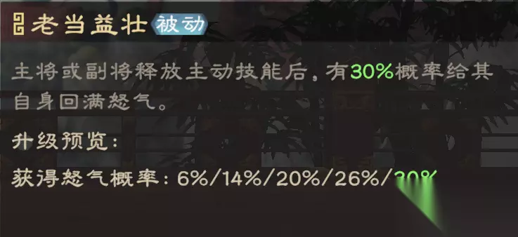 黄忠武力成长为1.22,可输出较高的主动技伤害,主要是作为副将使用。被动可为部队提供伤害加成,在主将、副将释放技能后概率使其回满怒气,如果一次性释放2轮主动技,可快速压低敌方兵力(爆发更高,但受触发概率影响)。 【技能解读】 1、怒气技:
