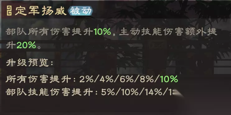 黄忠可通过定军扬威提高部队所有伤害、主动技能伤害,适配主动技能伤害较高的武将(武力成长、系数越高越好)。在己方武将释放主动技后概率给其自身回满怒气,相当于可以一次释放2次主动技,可快速削减目标兵力。白板技能概率仅有6%,升到3级以上才有足够的强度。 3、技能升级 老当益壮>定军扬威>怒气技>百发百中 老当益壮一定要有较高等级,黄忠才能发挥价值,此技能优先提升。后续如果有资源,可提升定军扬威、怒气技等级。黄忠自身输出效率偏低,主要依赖主核的输出,主核练度越高,搭配黄忠的爆发就越强。 4、星级简析 黄忠建议解锁老当益壮,并且技能提升到2级(及以上)再玩,有一定的养成门槛。被动触发后可回满怒气,大幅提升队伍爆发。黄忠觉醒后可大幅提升队伍生命值,提高持续作战能力。作战时间拉长,被动就能有更稳定的发挥。 二、阵法推荐