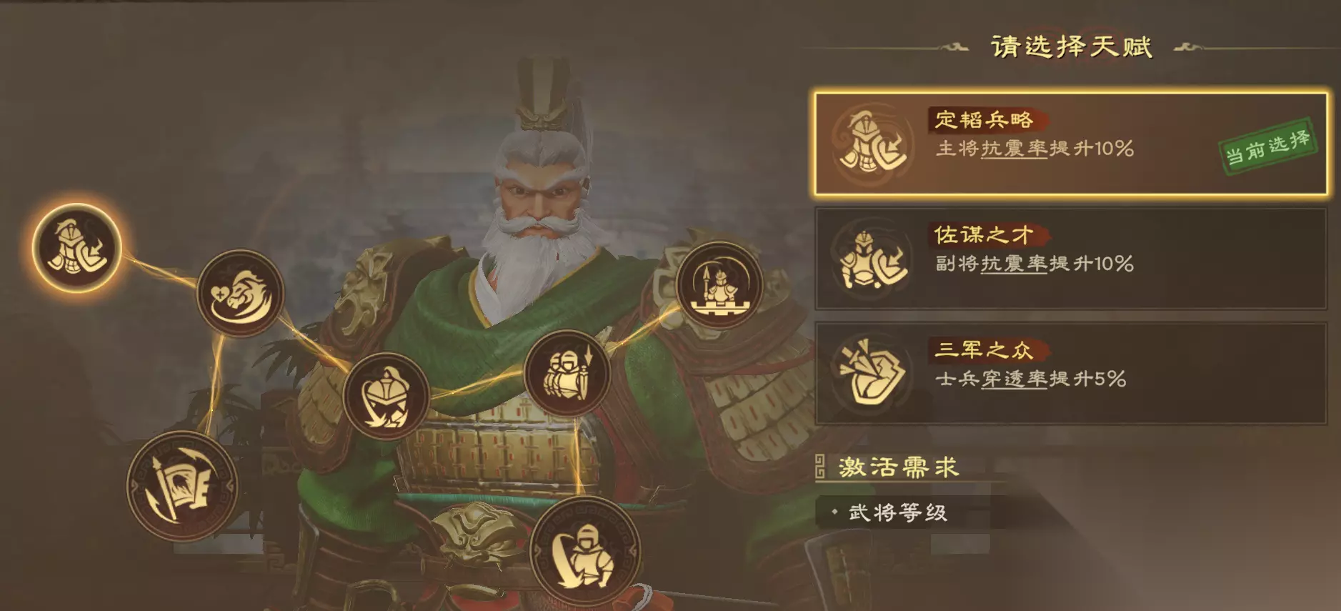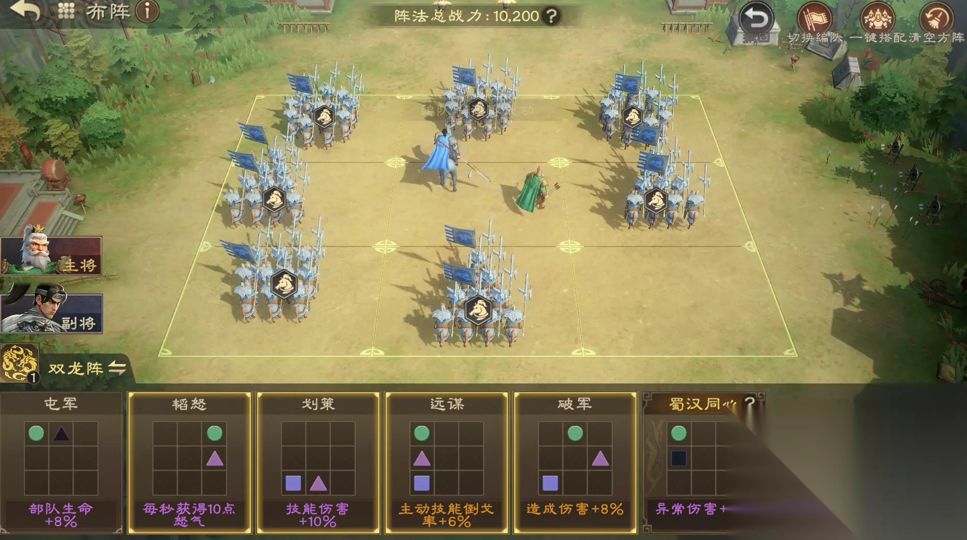 双龙阵可提升队伍暴击、暴击伤害,可大幅提高队伍整体伤害。在阵型方面,建议优先选择韬怒、划策、远谋、破军,提供回怒、造成伤害增加,均可稳定提高输出。 除了用双龙阵以外,也可以选择七星阵,在队伍普攻后可提升技能伤害,但伤害爆发不如双龙阵高。初期缺少珍品阵法,可用锋矢阵下位替代。 三、天赋加点