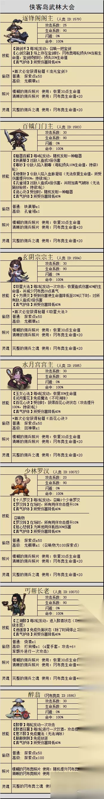 说书人 消耗200探索点打赏,获得一个随机奇闻轶事道具,每种只能获得一次 奇闻轶事逐锋阁 使用:获得100探索点逐锋阁的破尘宝剑之所以不常被使用,是因为它的灵智不够高,曾经把狗的粪便当成敌人砍了过去。 奇闻轶事逐锋阁 使用:获得100探索点逐锋阁阁主一直暗恋水月宫宫主,他明明知道,水月宫宫主喜欢的是玄阴宗宗主,却还是天天给他们俩买早饭。 奇闻轶事百钺门 使用:获得100探索点百钺门对外宣称掌握着上百种器械,其实是唬人的,实际上掰掰手指就数的过来。 奇闻轶事百钺门 使用:随机获得一个暗器百钺门门主之所以从小苦修暗器,其实是因为他根本没有修炼内力的天赋。 奇闻轶事醉翁 使用:获得150探索点前几日,有个醉鬼于子时在道上徒歌,好像在唱什么.....我是一只披着羊皮狼?你说他脑子是不是喝糊涂了? 奇闻轶事醉翁 使用:随机获得一瓶烧酒或百草酒醉翁不仅白天闹腾,晚上也吵得大家无法入睡,曾经大半夜在集市上瞎吼,‘宫廷玉液酒,一百八十两一杯酒!咋不去抢呢? 奇闻轶事醉翁 使用:获得150探索点当年岛主选举大会可谓笑点颇多,千杯不醉的醉翁闯到了最后一轮,因酒耗尽而跑回家取酒,最后时间耗尽被迫弃权。 奇闻轶事水月宫 使用:获得100探索点这个秘密,也许连水月宫的弟子们都不知道,其实水月宫宫主是男儿身。 奇闻轶事水月宫 使用:获得100探索点水月宫宫主虽然追求者数不胜数,但却唯独喜欢玄阴宗宗主。 奇闻轶事侠客 使用:获得铁杵神丹×1有位侠客为了功力大增,想偷药师的大补丸,谁曾想偷错了,拿成了铁杵神丹。铁杵神丹 使用:冈布奥生命值 20 奇闻轶事玄阴宗 使用:获得100探索点玄阴宗宗主深得水月宫宫主青睐,可宗主外出都手翘兰花指,并与各路夫人姐妹相称。 奇闻轶事侠客岛主 使用:获得200探索点侠客岛主曾经利用权力舞弊,依靠轮空轻松夺得了武林大会冠军。后来,由于江湖人士的声讨,武林大会禁止了他的报名。 奇闻轶事武僧 使用:对武僧造成伤害提升3%每夜亥时武僧必踏入怡香院,这也是为何他每天都精神萎靡的原因吧! 奇闻轶事拳师 使用:对拳师造成伤害提升3%有位很厉害的拳师,名叫独孤求败,他走在道上被流浪猫抓伤了左眼,从此江湖上流传着一句:喵喵拳求败! 奇闻轶事刀侠 使用:对刀侠造成伤害提升3%传闻刀侠苦修刀法多年,因此总是能切中要害,只是狠起来连自己都砍。 奇闻轶事药师 使用:对药师造成伤害提升3%据说岛上的一位药师,从小便患有先天病疾,因找不到医治方法而只好自学制药。 奇闻轶事道长 使用:对道长造成伤害提升3%有位道长依靠某本秘籍偷取万物特性,当他对着麋鹿使用后,竟然因此迷路了......从此这本秘籍就失传了...... 奇闻轶事剑客 使用:对剑客造成伤害提升3%传闻剑客最惧怕的就是幻影身法,因为每次他都会拔剑四顾心茫然。 奇闻轶事侠客岛主 使用:对侠客岛主造成伤害提升3%传说中的侠客岛主本为街头混混,当上岛主后野心大增,无恶不作,但他也有一个致命弱点,那就是贪图美色。 奇闻轶事武侠 使用:受到人类造成伤害降低2%侠客岛的武侠们,不会请你吃腊八粥,只会请你吃沙包大的拳头。