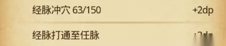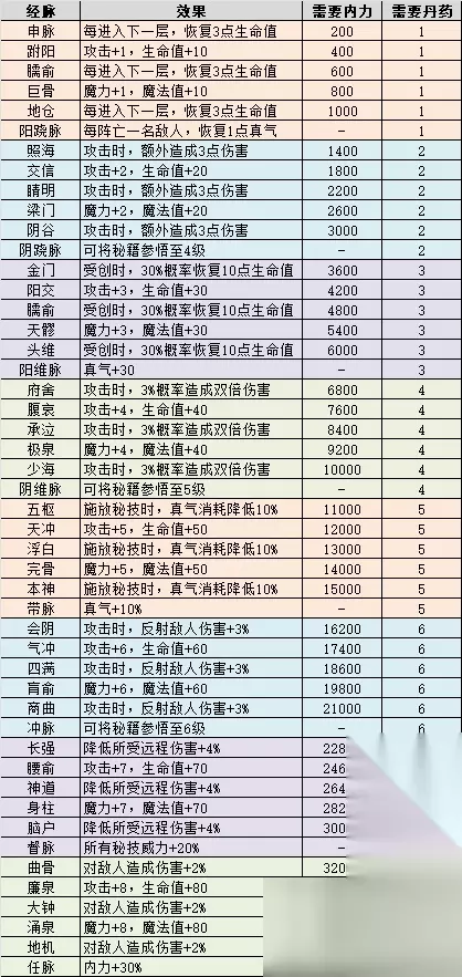 1. 修行属性说明 内力:影响经脉冲穴,且影响部分秘籍和道具的效果,每500点内力,攻击及魔力 1。 内力的主要来源是秘籍《明镜止水》的下楼增加、使用回神草、门主传功、参悟秘籍、瀑布修行等 参悟点:用于升级秘籍,参悟点的主要来源是杀怪、使用龙鳞草、冥想室等 真气:用于施放秘技的消耗,真气的主要来源是秘籍《冲虚养气》的下楼回复、使用荀草回复等。 真气初始100点,打通带脉可提升10点,使用药神残骸的灵芝可提升10点(灵魂强化后20点),大盗神彩蛋可提升5点 2. 经脉 共有8条经脉,每条经脉有5个穴位,达到指定内力后,可消耗固本丸进行冲穴。5个穴位全部打通后可消耗培元丹打通经脉。