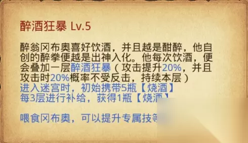 隐藏拿法 1. 在【酒窖】取酒,10%概率遇到【醉翁】 (8次保底),与他【共饮一杯】,开启隐藏任务线 2. 第二次在【普通层】遇到【醉翁】,【送他一壶】酒 (注意身上要留一壶酒) 3. 第三次在【啸聚营】(夹层) 遇到【醉翁】,打完怪后解救他 4. 第四次在【Boss层】遇到【醉翁】,打败boss后对话【接收美酒】 5. 在下一次通关【武林大会】后会出现【醉翁】,打败他,首次获得【醉翁冈布奥】,后续获得碎片*20 三、地图怪物介绍 本图怪物全部为人类怪,自带伤害减免,BOSS战期间刷新小怪。