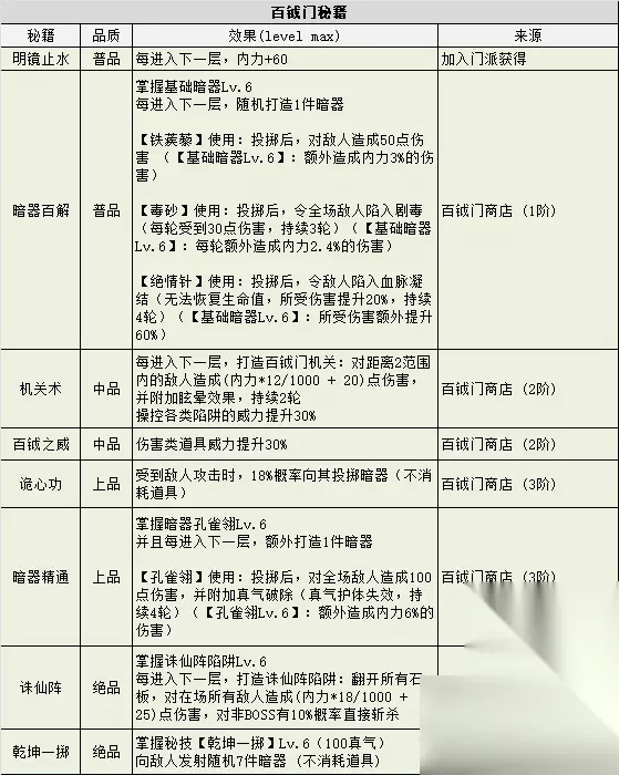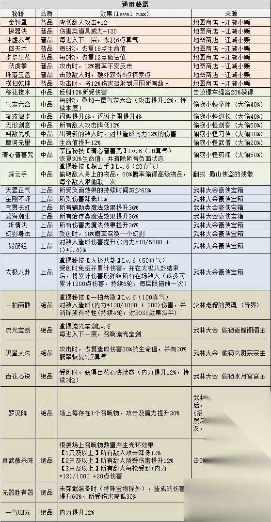 秘籍系列, 这里说说35本秘籍的拿法 《一般不会漏的秘籍》(28本) 首先是普品的8本 和 门派秘籍的8本,这16本是最容易拿的,分别在普通层商店和门派商店里 然后是上品的8本,这8本的来源是武林大会的通关宝箱,15层开始,到85全部拿完 中品《移花接木》,押镖打强盗有概率出,虽然概率比较低,但镖车强盗出的很多,一般容易拿到 中品《探云手》,翻蜀山侠盗的残骸获得,只要遇到残骸就能拿到 绝品《一拍两散》,异界翻少林老僧的残骸,使用灵魂获得 绝品《一气归元》,瀑布获得,有保底 《容易错过的秘籍》 (12本) 绝品《流光宝剑》,《吸星大法》,《百花心诀》,这三本要探云手 (或者其它盗窃技能) 去偷武林大会的三个门主,因为遇不到自家门主,所以只有暗器门可以拿3本,剩下的门派只能拿2本 中品6本,分别对应偷6种小怪,需要出大偷然后大偷基础上概率偷到,建议升满探龙手再偷。武僧的书概率最低,可以放在最后。《气定六合》(拳师) 《凌波微步》(道长) 《无形剑意》(剑客) 《料敌先机》(刀侠) 《摩诃无量》(武僧) 《清心普善咒》(药师) 绝品《真武截杀阵》,击败boss15%获得,无保底 绝品《罗汉阵》,武林大会 少林罗汉出现后,拖回合让他召唤全部18个罗汉(招完就不会再倒计时了),然后打败除本体外的所有罗汉,最后打败本体获得,这个比较难拿,因为本体很难活到最后 绝品《无器胜有器》,大盗神彩蛋 40本里拿35本,现在偷盗概率改的很高了,这个dp已经不算难做