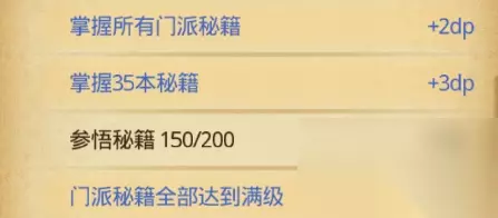 茶树 采摘花朵 获得 茶树花使用:冈布奥生命值 10 5. 秘籍 秘籍分为通用秘籍和门派秘籍,通用秘籍都可以获得,门派秘籍只有对应门派可以获得。 门派秘籍在门派驻地商店里使用门派信物购买,通用秘籍则在地图探索中获得。 部分秘籍会激活一个秘技,就是消耗真气使用的主动技能,分类在法术书的特殊页。 秘籍按品质分为普品、中品、上品、绝品,不同品质的秘籍升级需要的参悟点不同,在升级时依照品质获得内力。 秘籍升级的上限取决于打通的经脉,初始可升3级,最高6级。在打通阴跷脉、阴维脉 和 冲脉时 会提升上限。 普品秘籍升级需要参悟点: (当前等级 1)*8获得内力: 当前等级*20 中品秘籍升级需要参悟点: (当前等级 1)*16获得内力: 当前等级*40 上品秘籍升级需要参悟点: (当前等级 1)*24获得内力: 当前等级*60 绝品秘籍升级需要参悟点: (当前等级 1)*45 获得内力: 当前等级*100