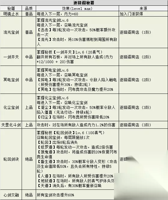 4)门派商店:使用门派信物兑换门派专属秘籍和各类道具 商店分为4阶,第2~4阶商品需要200/400/600声望解锁,除已购买的秘籍外,其它道具再次进入时会刷新 门派信物和声望的来源只有门派任务和柜坊捐探索点。 1阶商品: 普品秘籍x1(20) 龙鳞草x1(10)益母草x1(10) 固本丸x2(20) 2阶商品: 中品秘籍Ⅰx1(40) 中品秘籍Ⅱx1(40) 枯木春x1(20) 回神草x1(20) 固本丸x3(30) 培元丹x1(50) 3阶商品: 高品秘籍Ⅰx1(60) 高品秘籍Ⅱx1(60) 天青花x1(30) 凝草x1(30) 天青花 使用:碧血丹青状态(内力提升200%,持续5轮。碧血丹青结束后陷入萎靡,内力降低20%,持续本层)凝草 使用:获得2~4颗固本丸 4阶商品: 绝品秘籍Ⅰx1(100) 绝品秘籍Ⅱx1(100) 荀草x1(50) 七霞莲x1(50) 荀草 使用:元气状态(每轮恢复5%生命值及真气,持续6轮)七霞莲 使用:获得1颗培元丹\n所有秘技威力 3% 5)逐锋阁专属建筑