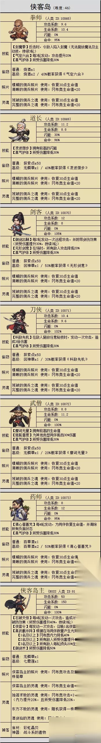 佛像 这座佛像巧借岩石暗托立在墙边,似乎正在注视着你。(参拜后,可提升内力及真气) 参拜: 获得真气上限 10,内力 50;唐僧师徒出战参拜时,效果翻倍 七、隐藏食谱 还阳羹 食用:冈布奥真气 10;内力 3% 隐藏食材【还阳散】翻找 蜀山侠盗的残骸 获得 八、抓拍照片 药师的照片 (限5次) 照片中的药师,正在治疗伤者。 途径:遇到药师抓拍(10%) 使用:冈布奥生命值 20 丐帮长老的照片 (限1次) 照片中的丐帮长老,正准备向你发起攻击。 途径:武林大会击败丐帮长老(15%)使用:获得5瓶烧酒 侠客岛主的照片 (限1次) 照片中的侠客岛主,正准备向你发起攻击。 途径:进入BOSS层抓拍(30%)使用:冈布奥攻击 5,所有秘技威力 5% 九、新药剂 药酒 (2星) 使用:降低敌人攻击 2;在侠客岛使用时,参悟点 50 艾灸秘药 (2星) 使用:恢复10%生命值;在侠客岛使用时,冲穴所需内力降低2% 超圣水 (2星) 使用:冈布奥魔力 2;在侠客岛使用时,获得的内力额外 5% 菩提涎 (3星) 使用:所有魔法效果提升4%;在侠客岛使用时,内力 2% 十、扫荡 和 DP 本图特产为 秘银*4 扫荡收益与地狱边境、第九十一区相同但目前加成球球没有雕像,所以金币排在第7,经验排在第4