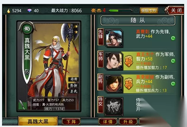 问:《啪啪三国》卡片怎么进阶?卡片进阶有什么条件? 答:另一个提升武将卡能力的方式,每次进阶会有十分大的属性提升,进阶越高作为随从后的属性转换率也越高。 基础介绍: 进阶层级:层级有普通、真、鬼、神4个等级