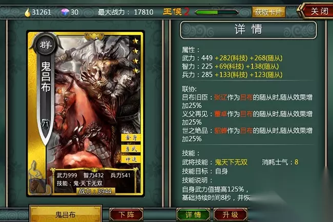 例:将一张银卡“关平”进阶为鬼卡,需要一张层级为真的30级关平作 为主卡,同时需要另外3张层级为真的银卡作为祭品。 P.S: 1. 进阶会消耗少量的卡魂,但进阶必定成功。 2. 只能用同品质的卡片作为祭品(即,金卡只能用金卡作为祭品)