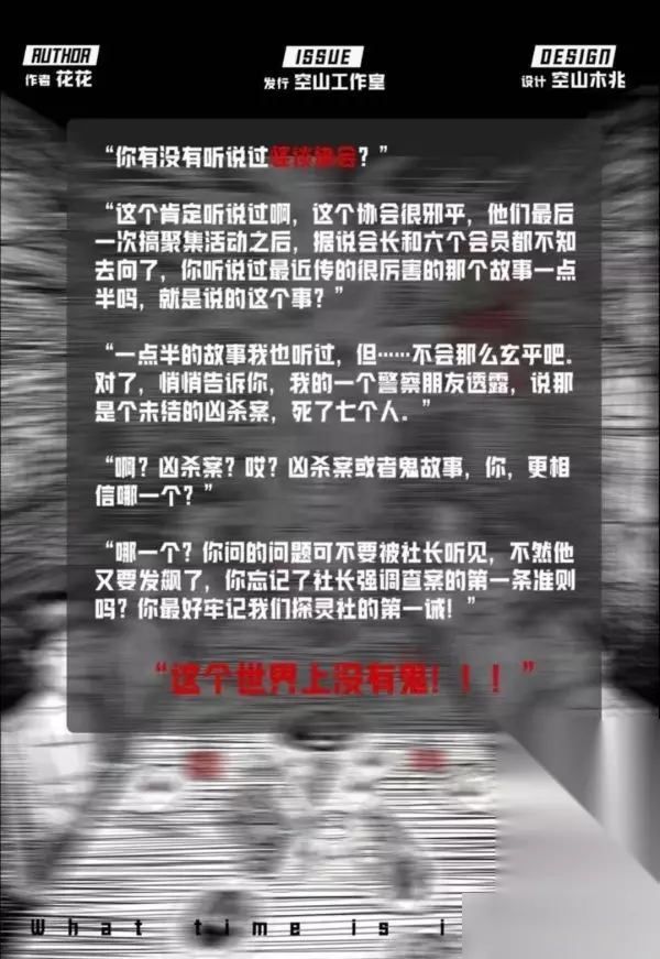 详细介绍 剧本介绍:“你有没有听说过怪谈协会?”“这个肯定听说过啊,这个协会很邪乎,他们最后一次搞聚集活动之后,据说会长和六个会员都不知去向了,你听说过最近传的很厉害的那个故事一点半吗,就是说的这个事?”“一点半的故事我也听过,但……不会那么玄乎吧。”“对了,悄悄告诉你,我的一个警察朋友透露,说那是个未结的凶杀案,死了七个人。”“啊?凶杀案啊?哎,你说这个鬼故事是谁编的?编的那么真呢!就像他看见了一样。”“凶杀案或者鬼故事,你更相信哪一个?”“哪一个?你问的问题可不要被社长听见,不然他又要发飙了,你忘记了社长强调查案的第一条准则吗?你最好牢记我们探灵社的第一诫!这个世界上没有鬼!”