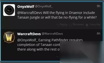 ·塔纳安丛林中的三个阵营声望达到崇敬:先知之手(联盟)/沃金之锋(部落),觉醒教派和刃牙追猎者 对于解锁德拉诺飞行,不少玩家在twitter进行了提问: