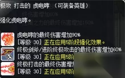 冒险家都有的冒险岛勇士 其他为被动BUFF不需要手动使用。 升级或者刷图的过程中,使用4转技能终极打击(一个技能用到老哦),由于常态终极打击攻击范围不大,日常刷图可通过V1燃灵之剑、超级技能战灵附体、V3斗争本能进行强化打击加大攻击范围。技能释放V1-战灵-V1-V3 循环使用大部分时间都可处于强化打击状态,也可穿插3转技能虎咆哮,超级技能狂怒连爆进行刷图,这两个技能攻击范围较大(可以攻击到上方的怪物,虎咆哮可跳起来使用,狂怒只能站立使用,据说下次技改方案中,4转技能烈焰冲斩的攻击范围大幅增加,或许能带来新的刷图体验,尽情期待吧)。 2、超级技能部分: 个人是这样加点的(进阶斗气-强化、进阶斗气-首领怪伤害、终极打击-强化、终极打击-额外段数、进阶终极攻击-额外机会),也有玩家选择终极打击的额外攻击或者进阶终极攻击的其他两项,玩家也可以根据实际情况调整): 3、超级属性选择: 普通玩家可以考虑优先选择均点加暴击伤害、伤害、首领怪伤害、无视防御、发动暴击这几个(加点比较灵活,想满暴击率,也可以先点几点暴击率,总体而言缺什么补什么),由于力量是没有%加成的,从图中可以得知: 因此力量优先级没有那么高,后续再加。 4、V矩阵技能选择: 由于英雄攻击技能单一,所以强化核心(三合一)的选择中,只需包含终极剑斧/进阶中级攻击和终极打击即可,第三个技能看个人喜好,笔者自己是用虎咆哮。