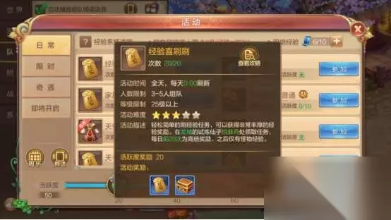 每日活动:每日活动经验也是很不错的,通过完成每日活动还可以刷新活跃值一举双得,岂不是美滋滋!活跃值达到100还可以获得丰厚的奖励呢!