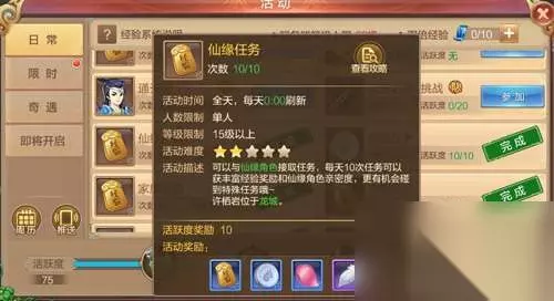 每日活动必做,经验喜刷刷。升级主要都靠的这个。给大家一个提示,做每日任务的时候组个队,然后全程充电挂机就OK。 仙缘任务:基本全程跑图,偶尔需要打打怪,总之经验给的都是很合理的。做这个任务主要是为了提升仙缘角色,能得到很多的属性加成。