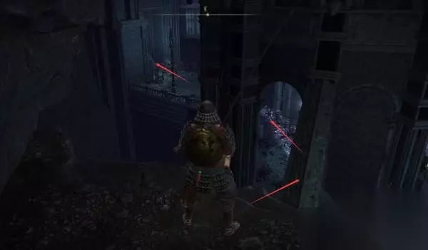 前提条件:打完碎星拉塔恩 探索“永恒之城”诺尔隆恩,来到倒水桥断崖赐福时,往下走,找到图2的位置,顺着箭头往前走,然后在后面的区域稍加探索会看见图3红框的NPC(通过罗杰尔遗书知道他是D的弟弟)无视他,不要对话,就算对话也不要交出孪生装备。