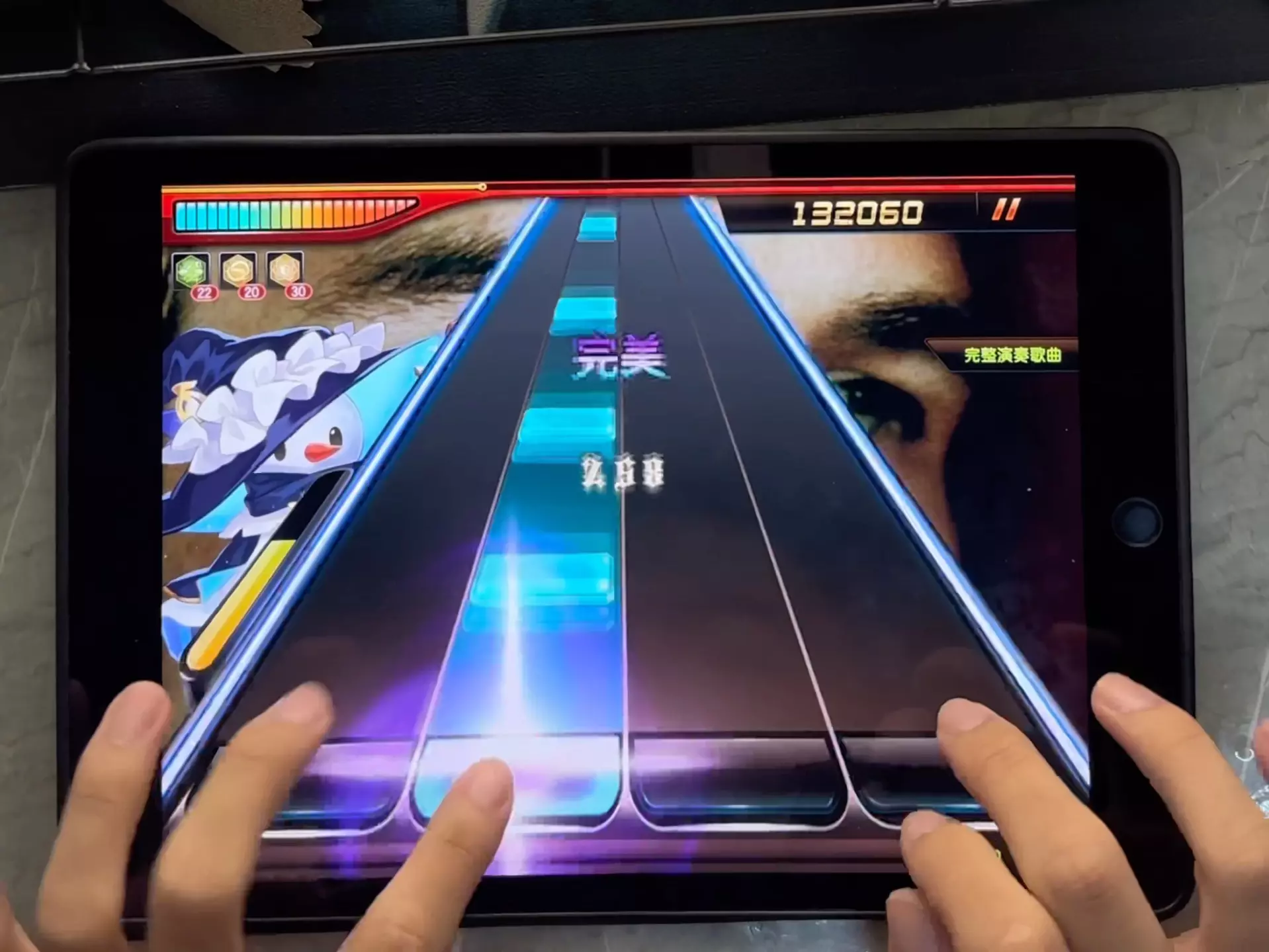这是一则音乐游戏相关内容,展示了在平板上游玩《一千光年》的过程,通过开启mv的方式,呈现游戏里的长条谱面,让玩家了解该长条谱面较长的原因,带来音乐游戏的实操展示。
