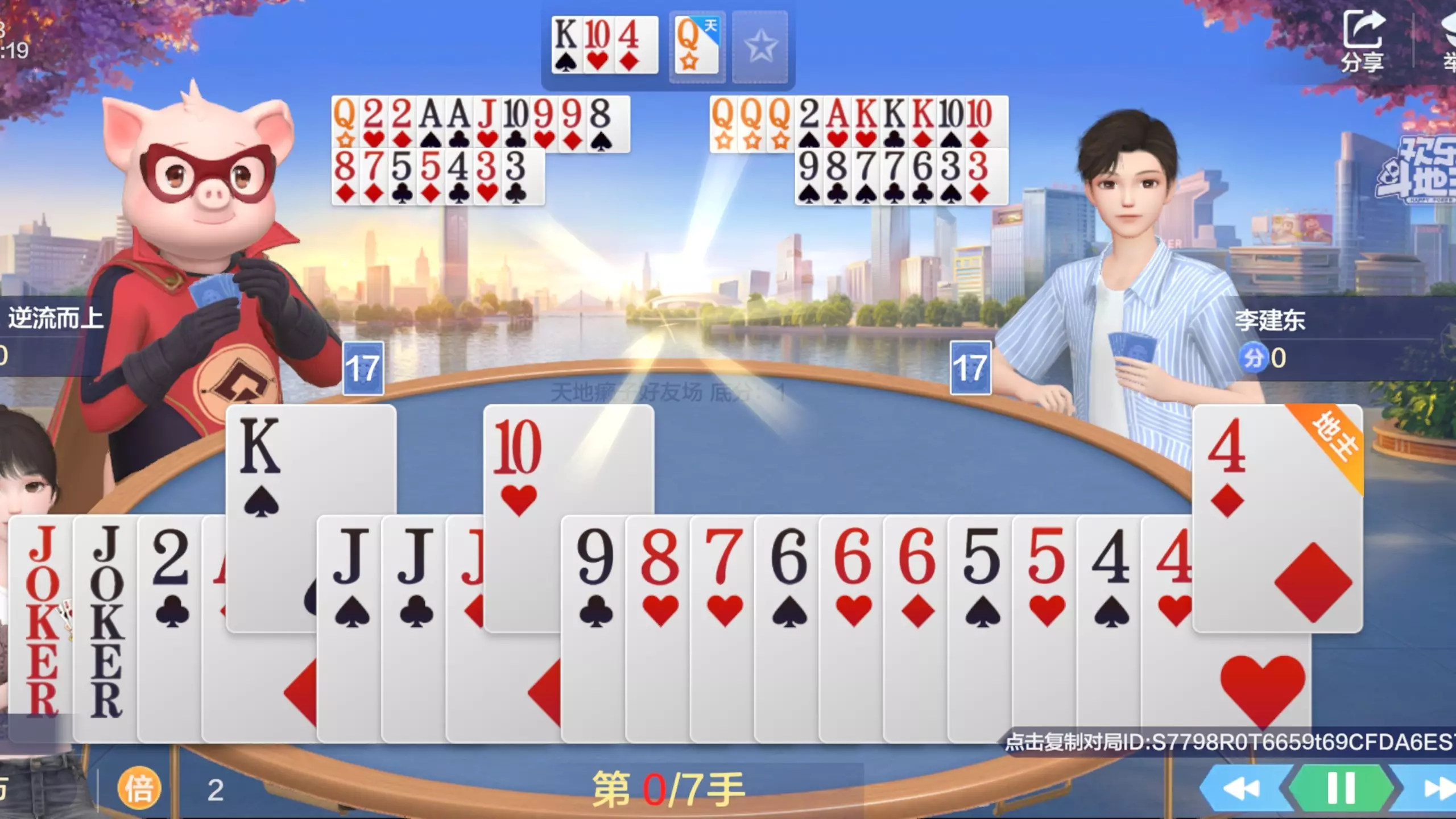 这是欢乐斗地主排位天地癞子场的对局,玩家展示了叫地主、确定癞子牌等游戏环节,最终打出18+17的春天牌型,呈现了欢乐斗地主的趣味对局过程。