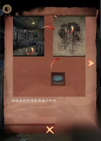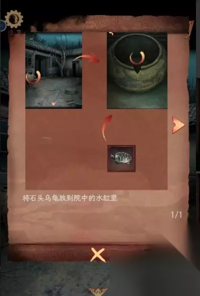 4、将木板放到缺口处来到二楼。 5、点击窗子可以观察到院子中四种物件上面有图案,得知木桩1个,木盆3个,木箱4个,麻袋6个,完成相关图案解密打开箱子获得红墨水。