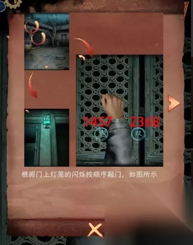 8、点击4个门中间的桌子获得符号提醒,观察上下柜子上的两个竹笼,将麻将桌上的四张一筒打出,再摇动筛子,显示为3,进入3号门。 9、依次进入4个房间后走出鬼打墙,根据四个符号的顺序解开门锁上的密码。