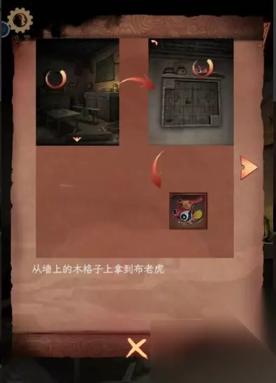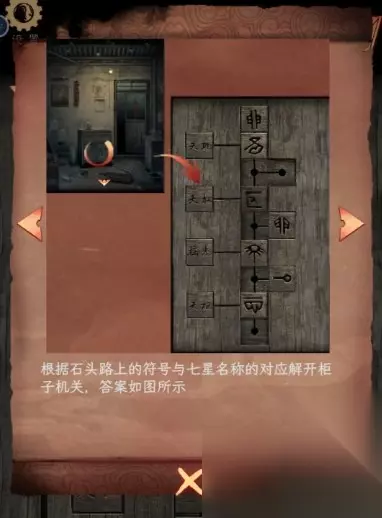 6、点击墙壁上照片对其使用红墨水让照片变得清晰,查看图片上的图案,点击柜子机关盒,再将图案位置调节一致,获得玩具灯。