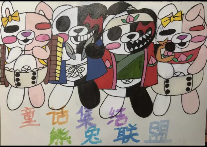 画的是弹丸论破1,弹丸论破2,弹丸论破V3处刑动画里黑白熊的穿搭,以及浦岛太郎,辉夜姬,狸猫,桃太郎等童话熊兔,还有怪兽熊熊和弹丸论破V3小剧场里出现的熊熊们.…