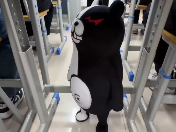 这是一个趣味改编内容,将蛋仔派对的形象融入弹丸论破的游戏场景中,出现了蛋仔形态的黑白熊,呈现出弹丸论破和蛋仔派对联动的趣味画面,带来独特的抽象玩梗体验。