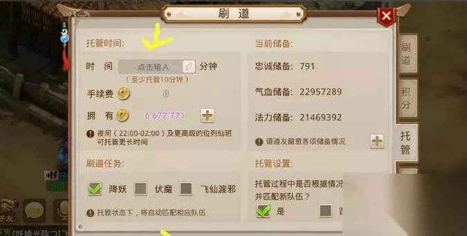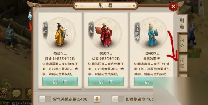 2、除此之外,我们还可以花费托管来摆脱老君查岗,我们点击刷道以后,点击托管,会进入托管界面。