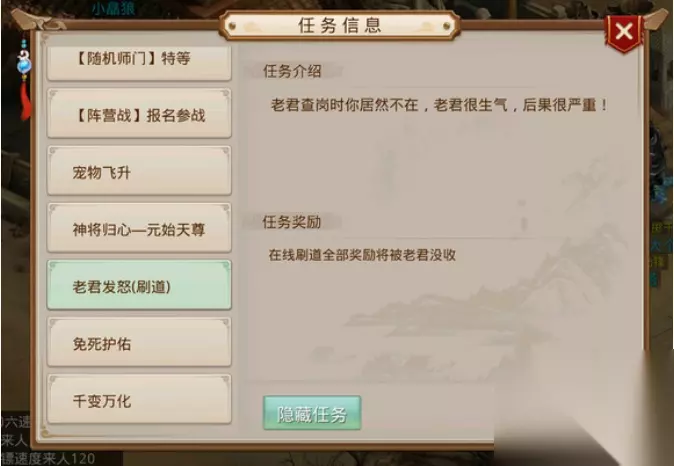 问道老君查岗怎么办 老君查岗介绍: 1、老君查岗就是说在你自动的时候会出现查岗,让你回答问题,如果没在规定时间内回答正确,则就判定为不在,就会受到相应的惩罚,或没收经验道行或者金钱奖励。