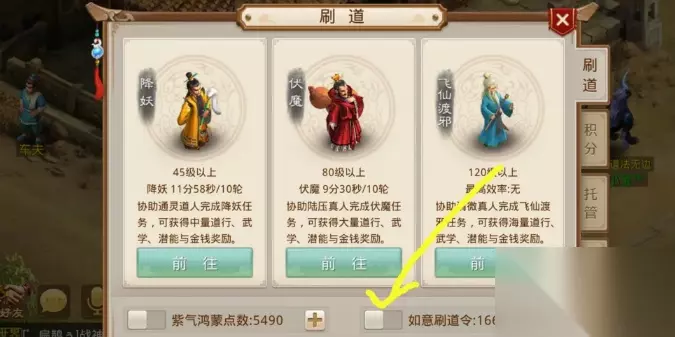 点击刷道以后,会进入刷道界面,然后我们再点击下方的如意刷道令,点击打开就可以了。这样子自动刷道就不会碰见老君查岗了。如果你没有如意点,只要队长有就可以了,所以说可以找几个好友一起玩,轮流当队长。